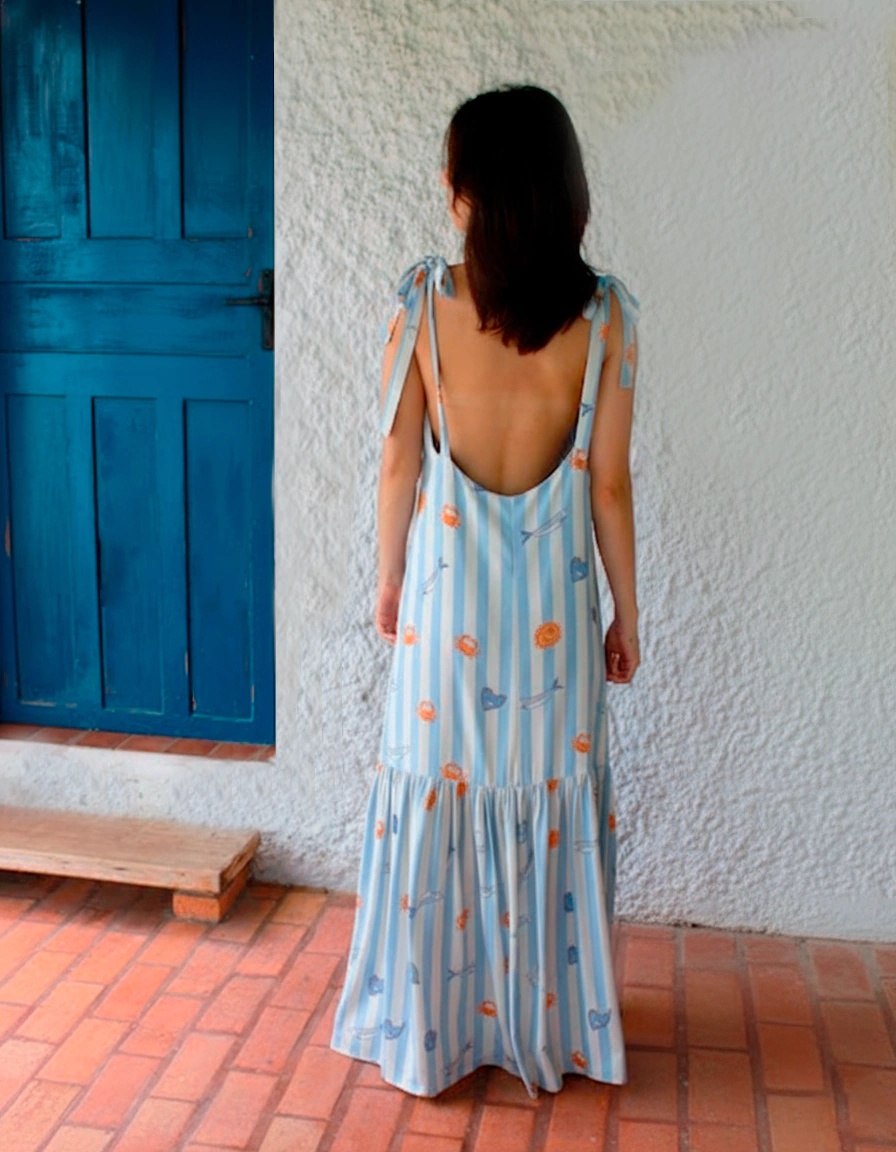 Feita em 100% viscose, tem toque leve, caimento fluido e listras que alongam o visual. As alças com amarração deixam o modelo mais moderno e ajustável, enquanto o recorte com babado na barra garante movimento na medida.